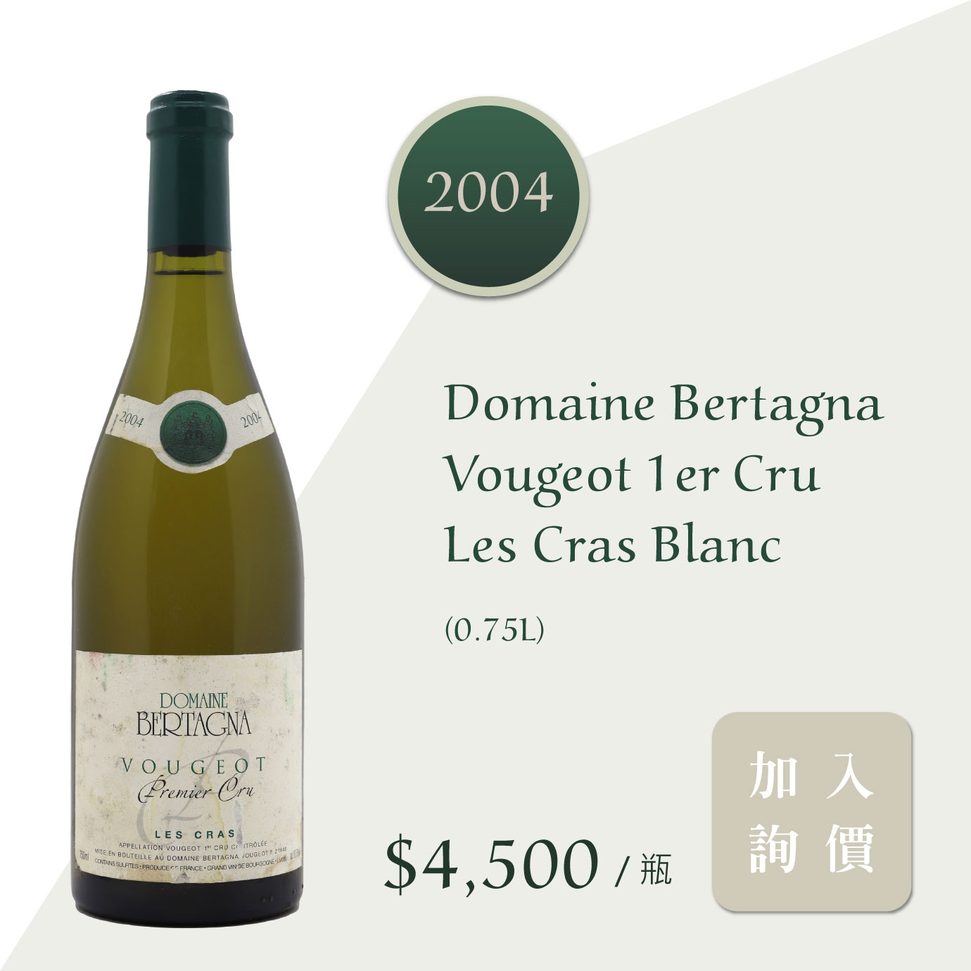 | 商品の特徴 | Domaine Bertagna - Vougeot Rouge 1er Cru Les Cras。Domaine Bertagna Vougeot 2022 | Vyno klubas。Domaine Bertagna Vougeot 1er Cru Les Cras Blanc 2023。2022年ヴィンテージのヴージョ・プルミエ・クリュ、シャルドネを使用した白ワイン。。Domaine Bertagna Les Petits Vougeots, Vougeot Premier Cru。- ブランド: Domaine Bertagna- ワインの種類: 白ワイン- 品種: シャルドネ- 地域: ヴージョ- ヴィンテージ: 2022- 特級: Premier Cruご覧いただきありがとうございます。【希少バックヴィンテージ】フィリップパカレ ビュル スパークリングワイン | ||